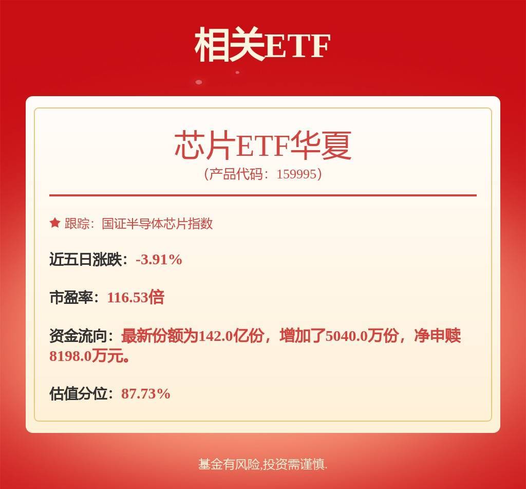 4月7日,三大股指早盘小幅拉升,其中芯片板块同样小幅上涨。截至上午10:45,芯片ETF华夏(159995)涨1.42%。相关成分股中,寒武纪涨8.42%、海光信息涨2.42%、中芯国际涨1.71%,兆易创新、长电科技、澜起科技等小幅跟涨。(以上所列股票仅为指数成份股,无特定推荐之意)
